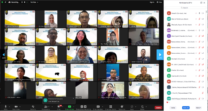 Dari pemaparan para narasumber, muncul antusiasme dari para peserta yang mengajukan beragam pertanyaan terkait isu peran Perpustakaan Perguruan Tinggi dan pengelolaan penerbitan. Webinar nasional ini dimoderatori oleh Lusiana Monohevita, M.Hum., selaku Koordinator Manajemen Pengetahuan UPT Perpustakaan UI. Peserta yang turut hadir lebih dari 775 peserta terdiri dari pustakawan maupun pengelola penerbitan yang tergabung dalam Zoom Meeting dan live streaming YouTube. Seminar ditutup dengan foto bersama di ruangan Zoom Meeting.